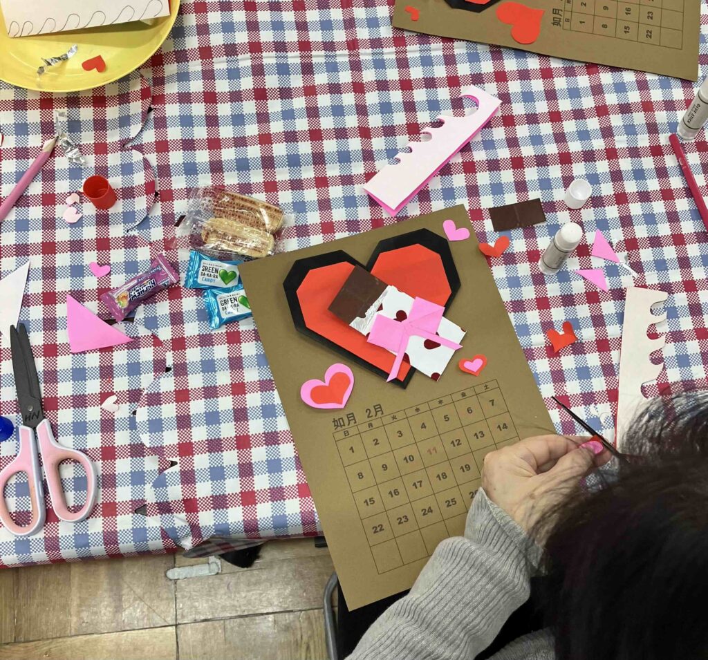 2月のデイ・ホーム世田谷は、バレンタインのプレートを皆さんと作りました。たくさんのハートとチョコをプレートに貼って楽しみました。